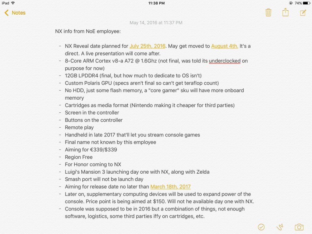 - El NX se revelara el 25 de Julio del 2016, podrían mover la fecha al 04 de Agosto. Sería un Nintendo Direct, seguido de una Presentación en vivo.
