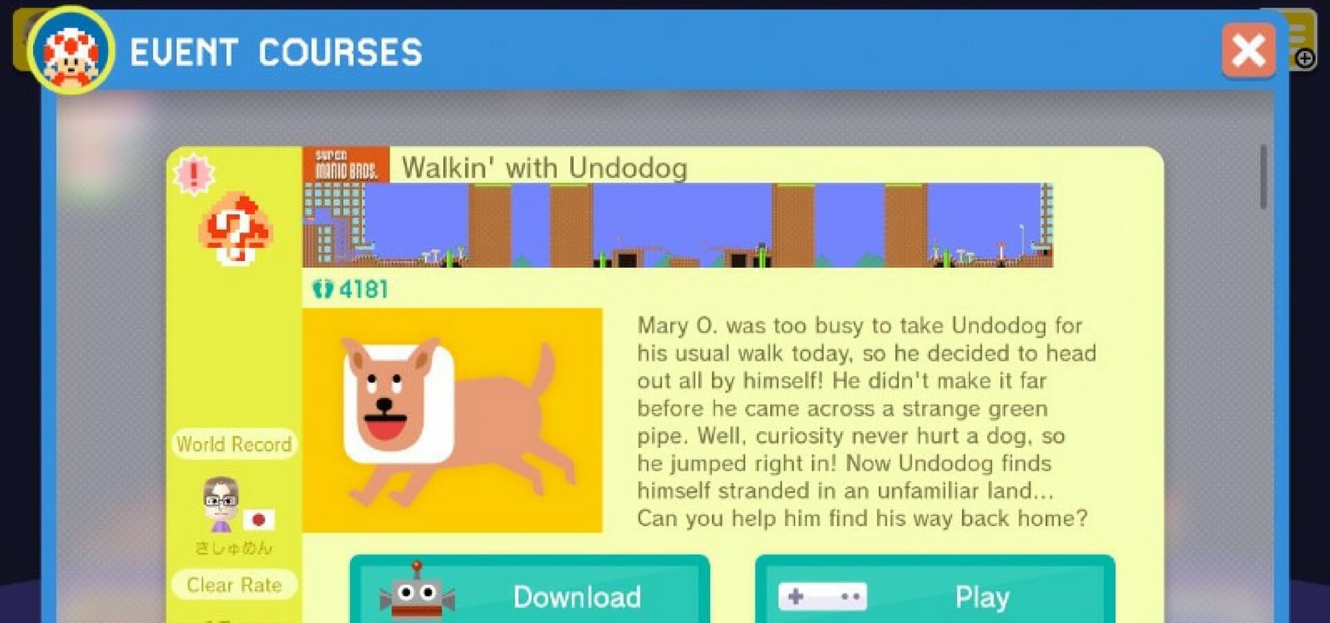 En esta ocasión, se ha confirmado un Nuevo evento llamado: «Walking with Undodog» para Super Mario Maker, el cual nos permitirá hacernos con el Traje de Undodog para personalizar a Mario a lo largo de la Infinidad de Niveles que puede haber para el Título:
