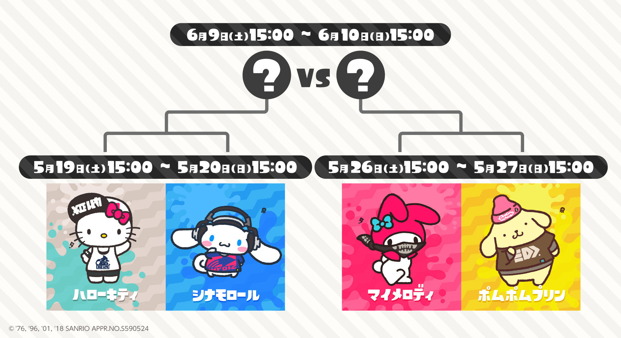 El Primer Splatfest se llevará a cabo entre Hello Kitty y Cinnamoroll, el Segundo Evento será entre My Melody vs. Pompompurin. Los ganadores de ambos eventos se enfrentarán en un Tercer Splatfest para decidir quién es el Ganador.
