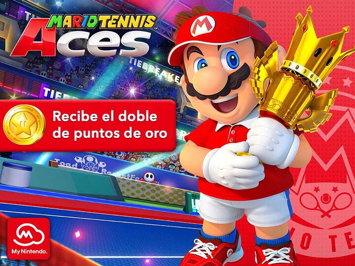 Puedes recibir el doble de puntos de oro al precomprar la versión digital del juego Mario Tennis Aces. Simplemente realiza la precompra en Nintendo.com (donde esté disponible) o en Nintendo eShop para la consola Nintendo Switch hasta el 21 de junio a las 23:59 (horario del Pacífico) para recibir 300 puntos de oro* adicionales.