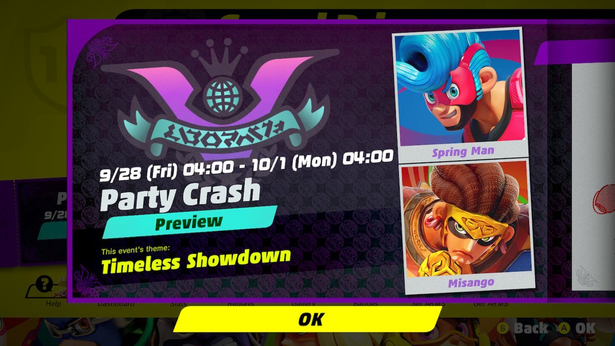 El día de hoy se ha confirmado una nueva Festilucha de ARMS para Nintendo Switch, bajo la temática: «Timeless Showdown». En esta ocasión se pondrá a competir la popularidad de Spring Man y Misango dentro del Evento: