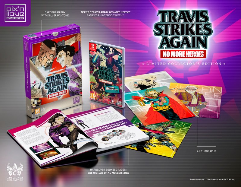 El día de hoy se ha confirmado el lanzamiento de la Edición de Colección de Travis Strikes Again: No More Heroes para Nintendo Switch. Esta Edición del Juego será publicada por Pix’n Love y traerá consigo una copia física del juego además de un Libro de Arte de pasta dura y algunas tarjetas con ilustraciones del Juego.