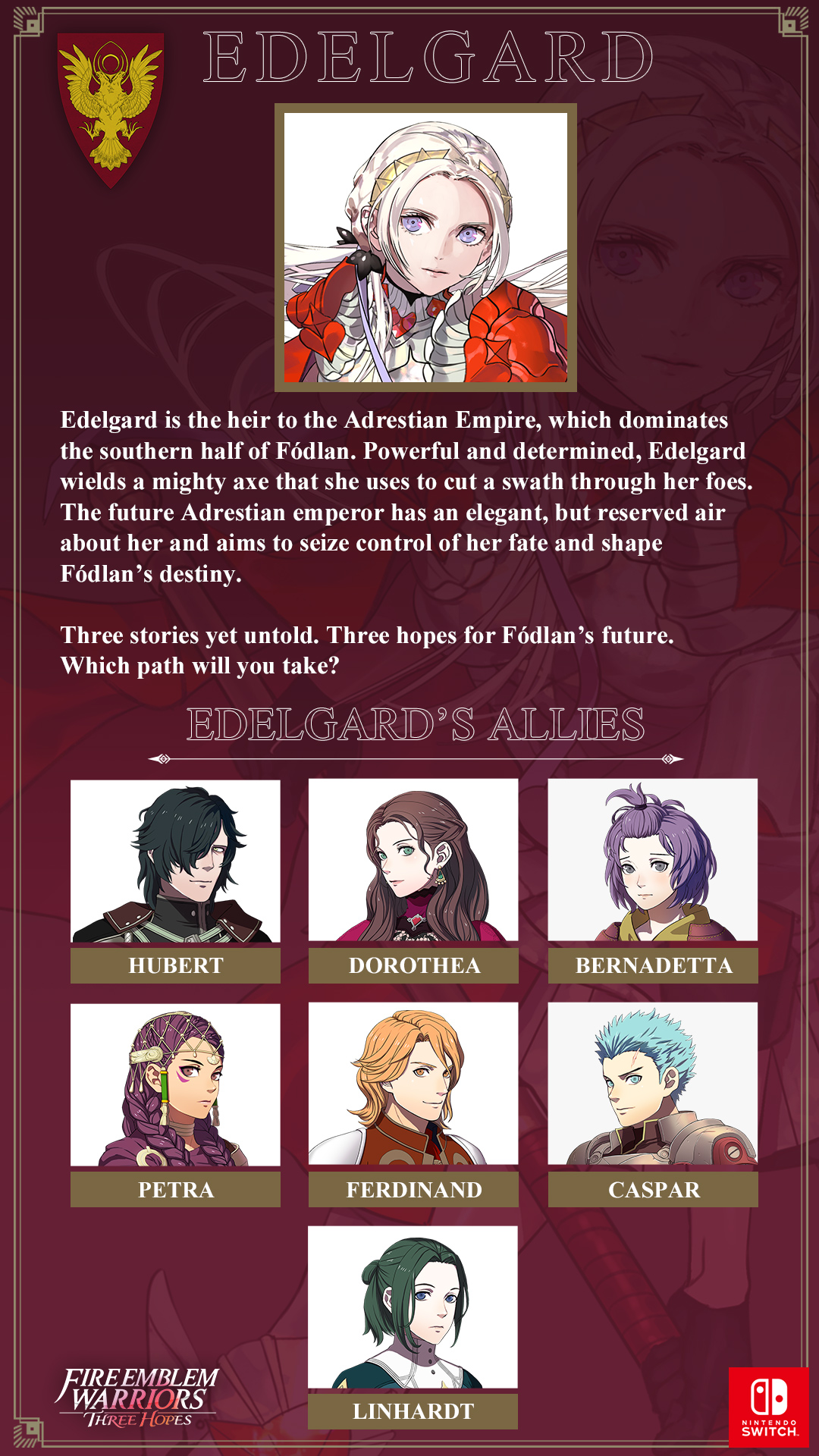 La cuenta oficial de Nintendo de América en twitter ha compartido una Infografía de Edelgard junto con sus compañeros del Adrestian Empire, personajes que podremos ver en Fire Emblem Warriors: Three Hopes para Nintendo Switch.