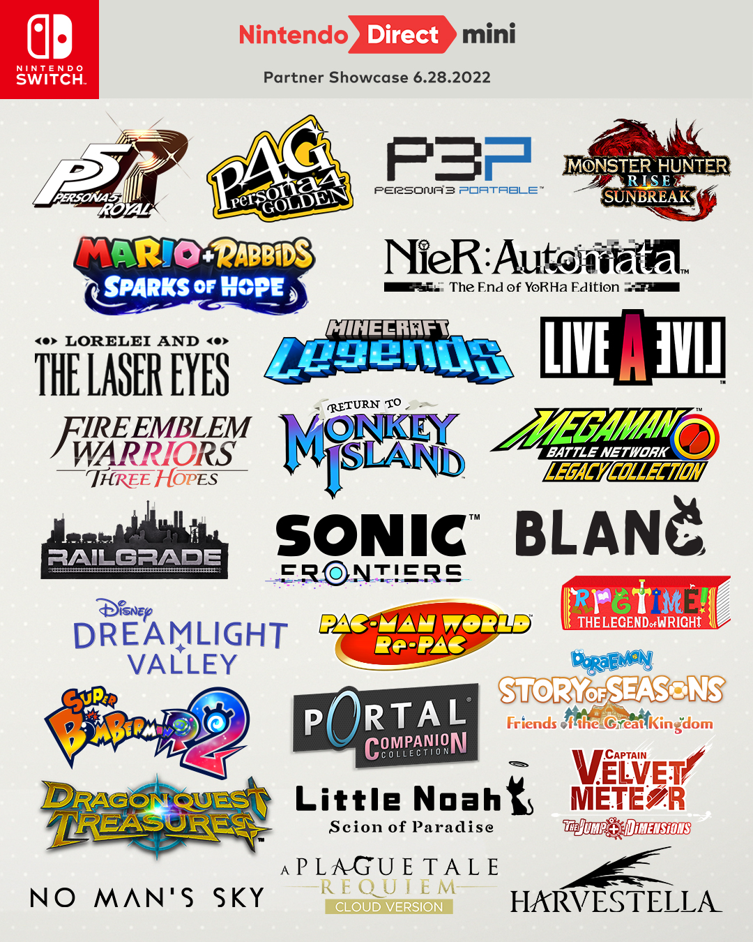 La cuenta oficial de Nintendo de América en twitter ha compartido una imagen en la que se muestran algunos de los juegos que se presentaron en el Nintendo Direct Mini: Partner Showcase del pasado 28 de junio del 2022.