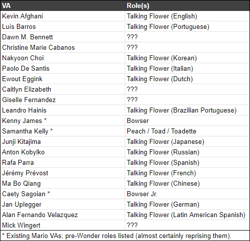Kenny James y Caety Sagoian serían Bowser y Bowser Jr., respectivamente. Un dato curioso es que la actriz de voz para Rosalina no sale en este datamine, lo que podría confirmar la ausencia de este personaje dentro del juego.